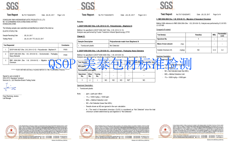 國際標準SGS實驗室也對YIMA膠針系列產品做了多項標準檢測:其中EN71-3是歐盟玩具有關有毒金屬含量的檢測;European council directive 是94/62/EC包材類指令檢測;